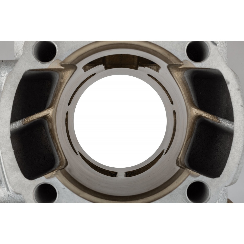 It is a high quality, very well finished aluminium cylinder with chrome / nickel coating with 5 transfer ports and bridged exhaust. It comes with a 53.95mm Vertex piston with 1 piston ring.