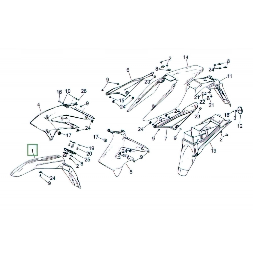 Original replacement part by Derbi: Front Mudguard black for Derbi Senda DRD X-Treme after 2010, identical to original part. Since it is an OEM spare part, you can simply swap it with the original, no modifications required.