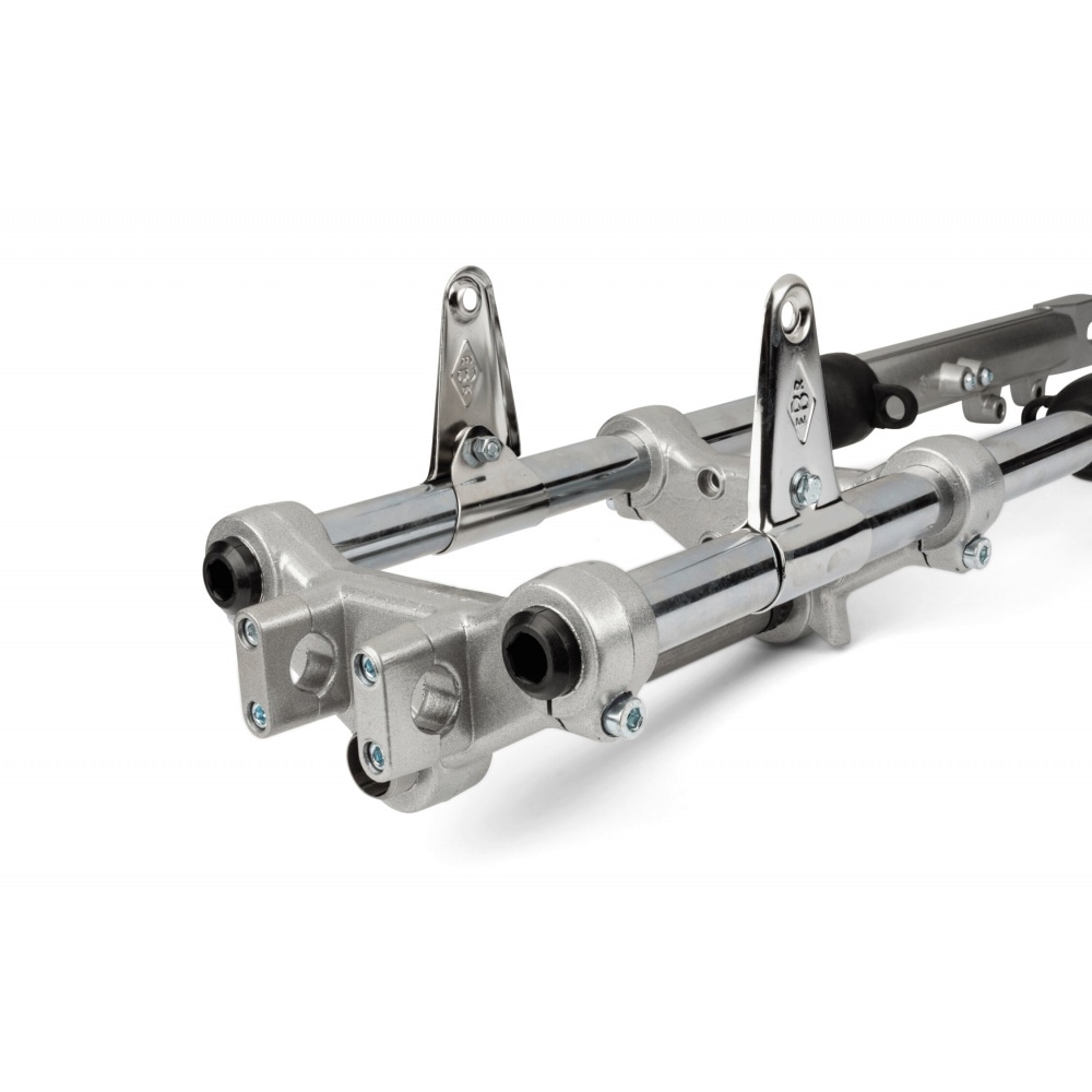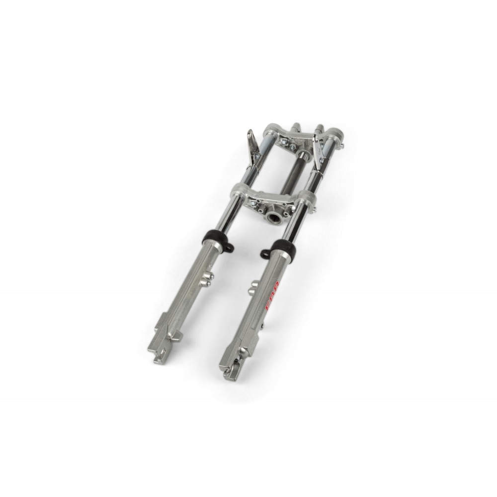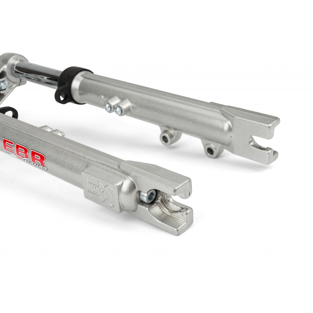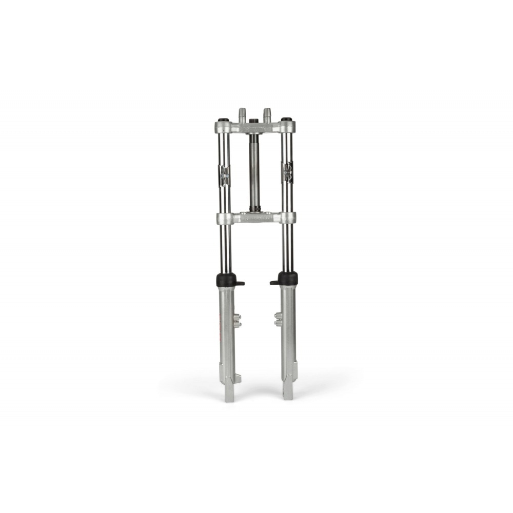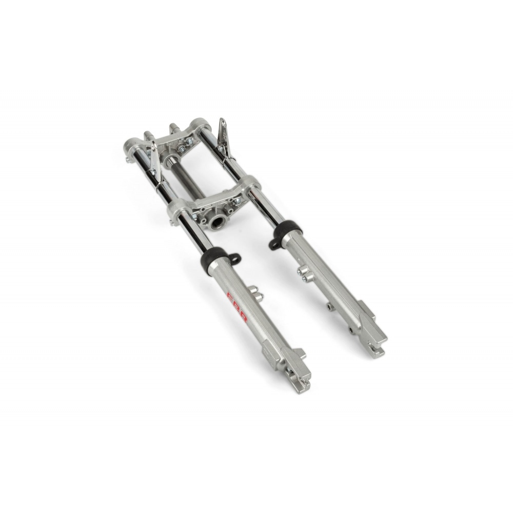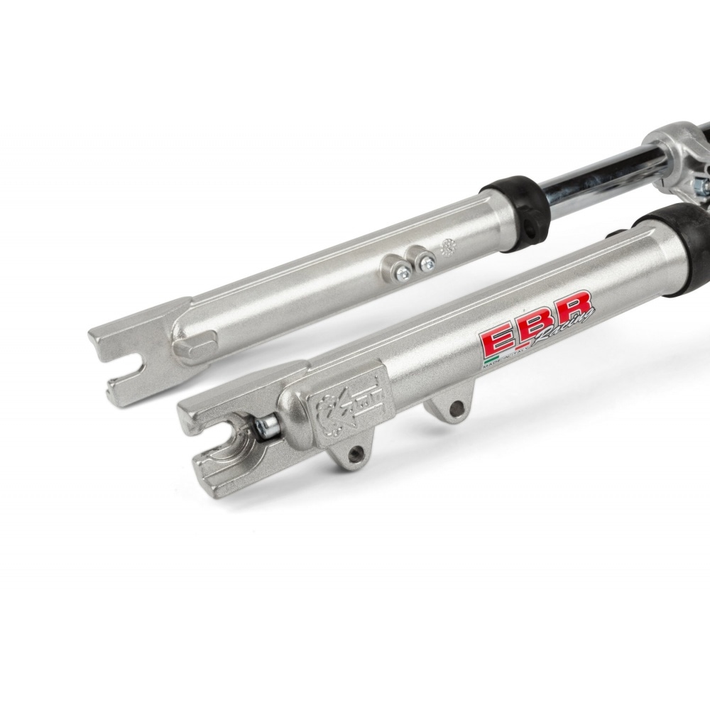 Fork EBR hydraulic silver d.28m Peugeot 103 / MBK 51, compatible with drum and brake discs. The oil is drained via 2 screws.