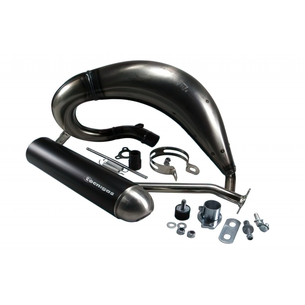 Exhaust Tecnigas E-NOX STEEL Derbi SDR Senda, Aprilia RX from 05/SX, RCR/SMT, with e-mark, without homologation, low-priced tuning exhaust made of steel, suitable for 50cc – 70cc sport cylinders (light tuning). Tecnigas uses steel here instead of stainless steel, which makes the exhaust a lot cheaper. With a simple paint job (high heat paint) you can pimp up and protect the exhaust.