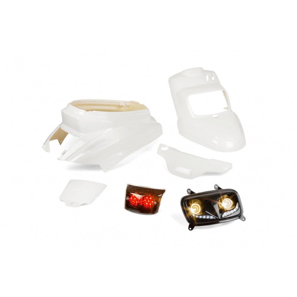 The fairing kit consists of 4 parts in white (headlight mask, handlebar cover, engine cover and rear fairing). To make it easier for you to choose the right lighting, we added front and rear lights, namely a fancy twin headlamp with 2 halogen bulbs and bright LED strips and a Lexus Black tail light with 16 LEDs.