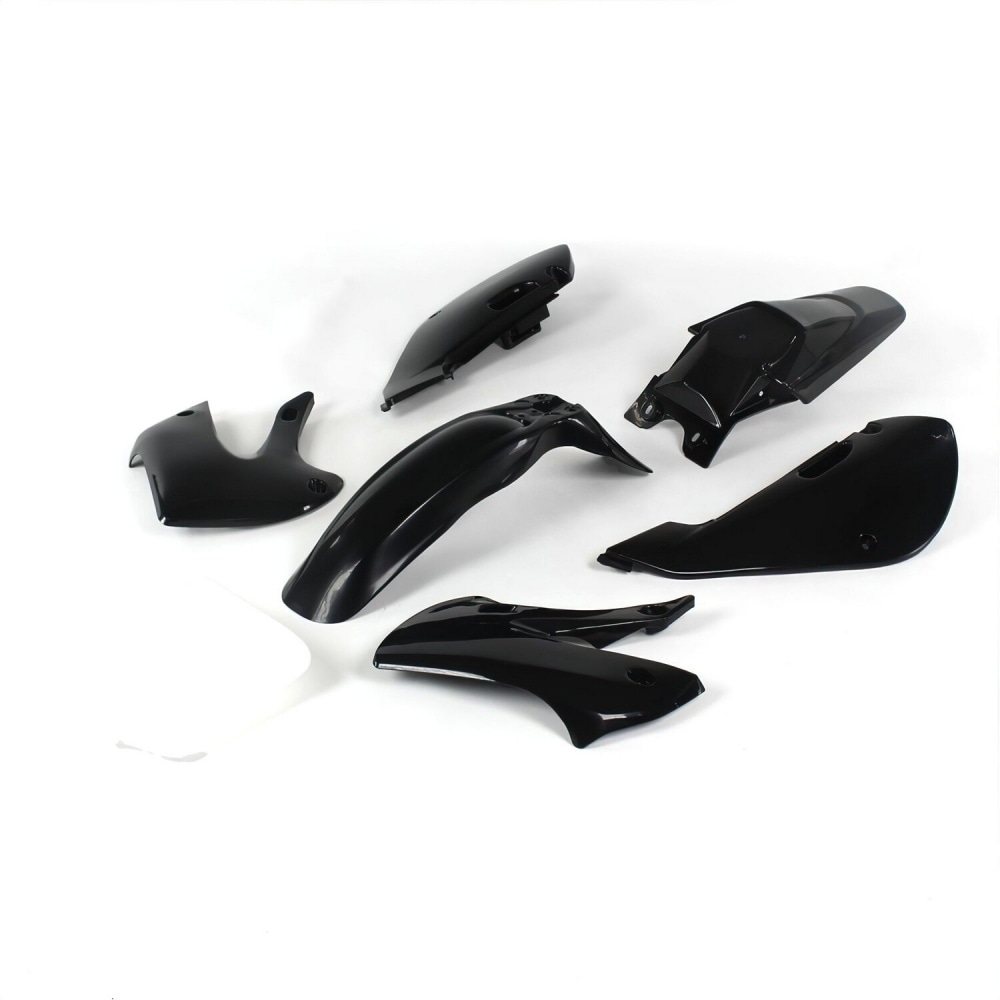 Fairing Kit black Pit Bike / Dirt Bike type KLX110.The fairing parts fit all pit bikes / dirt bikes with KLX110 fairing. Shapes and sizes are identical to the original plastics.