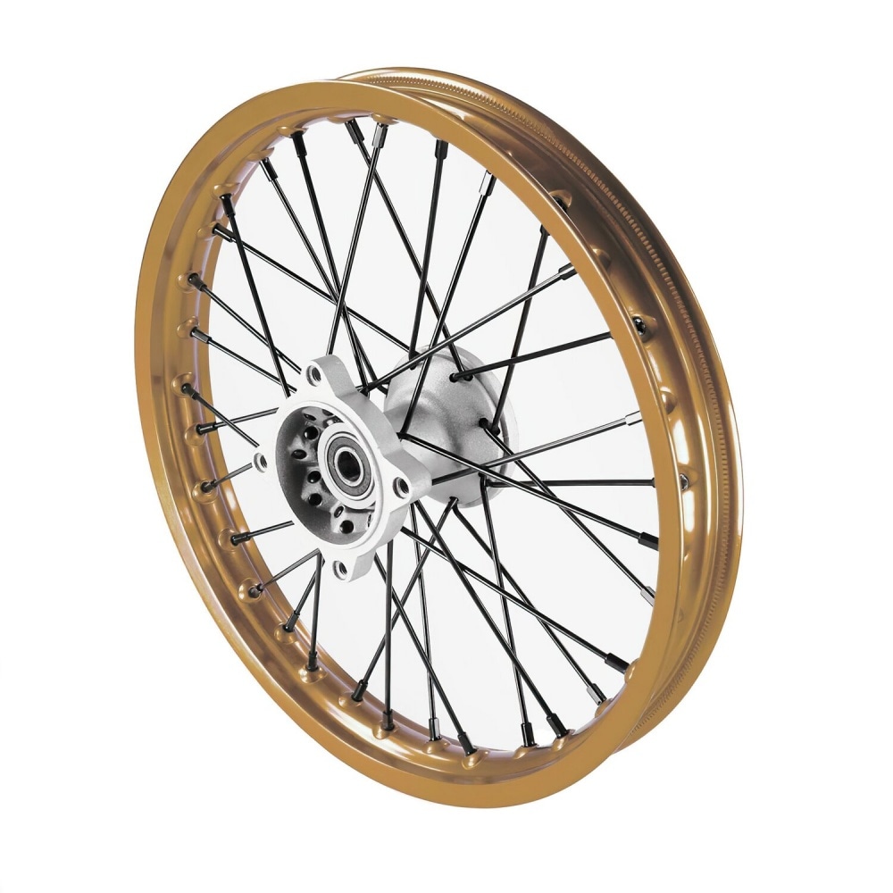 Переднее колесо / обод алюминиевая ступица 15 мм ось - 14" Pit Bike / Dirt Bike золотой, усиленный обод из анодированного алюминия - отличная идея на заказ для вашего переднего колеса.Ступица колеса - алюминиевая литая 76 мм ступица.