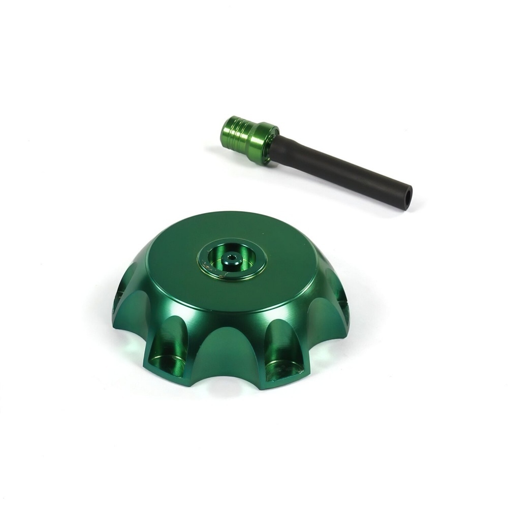 Fuel Cap CNC d.48mm Pit Bike / Dirt Bike green. Very stylish CNC-milled tank cap with vent valve / vent hose. The coloured anodization looks awesome and protects the cap from wear and tear, rust and other environmental influences.