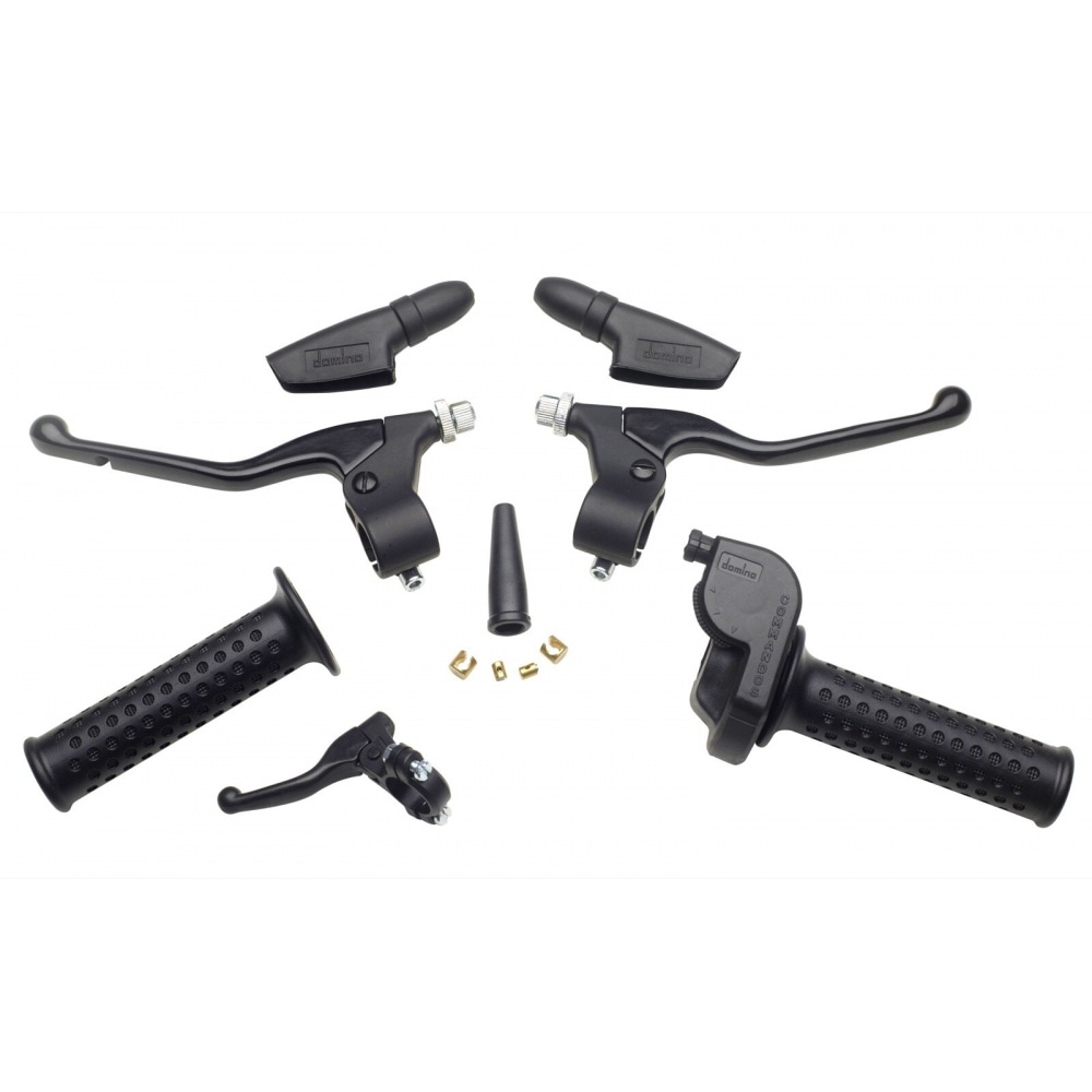 Полный комплект для руля: дроссельная трубка, резиновые рукоятки, рычаги тормоза или сцепления, рычаг обогатителя, включая регулировочные винты, ниппели и т.д. Универсальный комплект теоретически может быть установлен на многие различные модели двухколесных транспортных средств, но в первую очередь подходит для классических мопедов с передними барабанными тормозами.