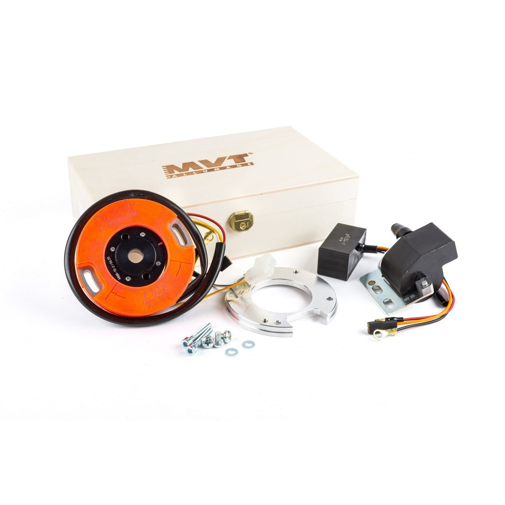 The MVT Digital Direct ignitions feature variable ignition timing controlled by a CDI unit (included), meaning that ignition advance is rev-dependent in order to max out performance. The HT coil provides a discharge current of up to 42,000 V at high rpm. In addition, the Digital Direct features a 12 V supply for lighting or the electric water pump which is not common for most ignitions. This way you can keep your lighting or run a water pump. This means you’ll have to keep your 12V battery. For even more power, we recommend using the MVT Eprom with different pre-programmed maps.