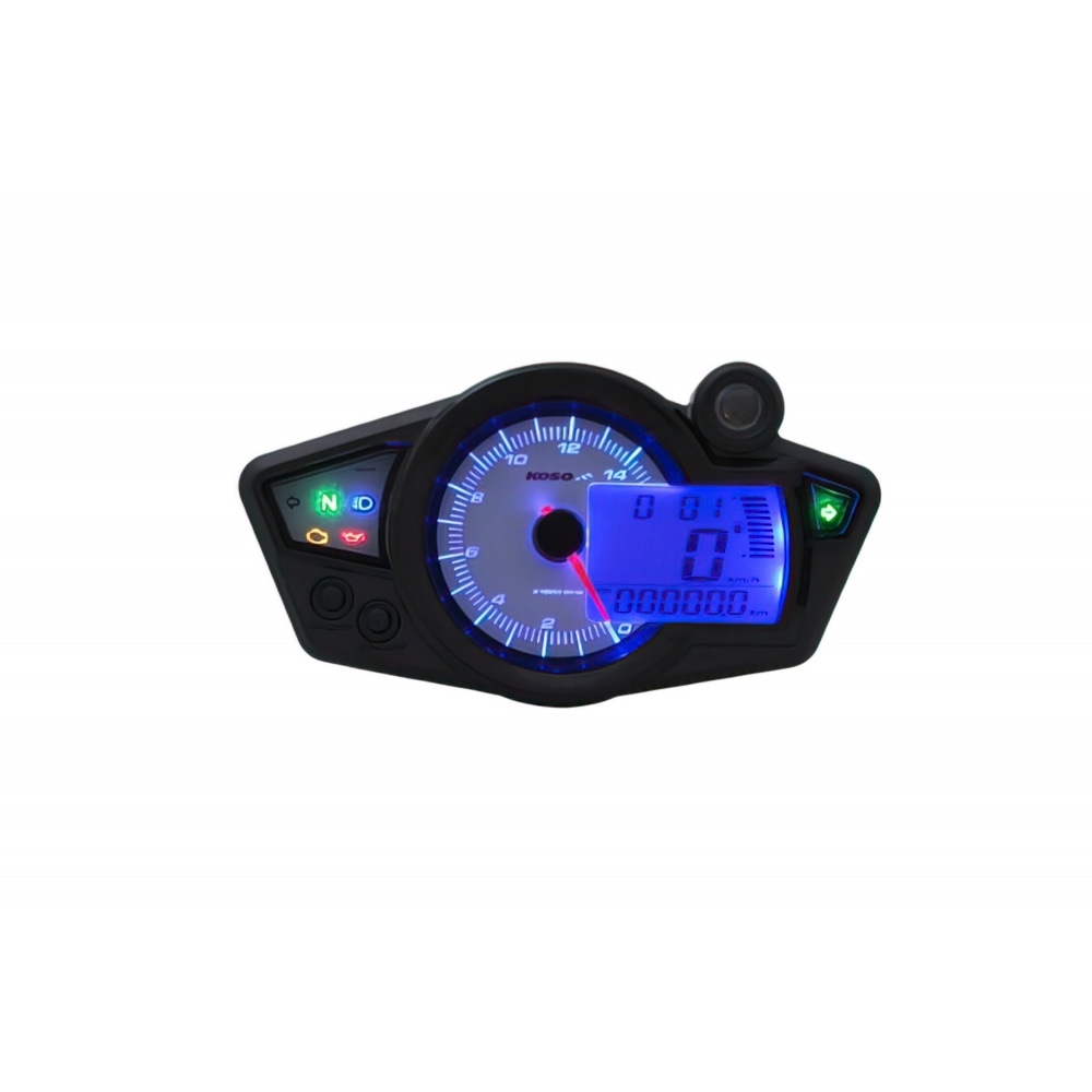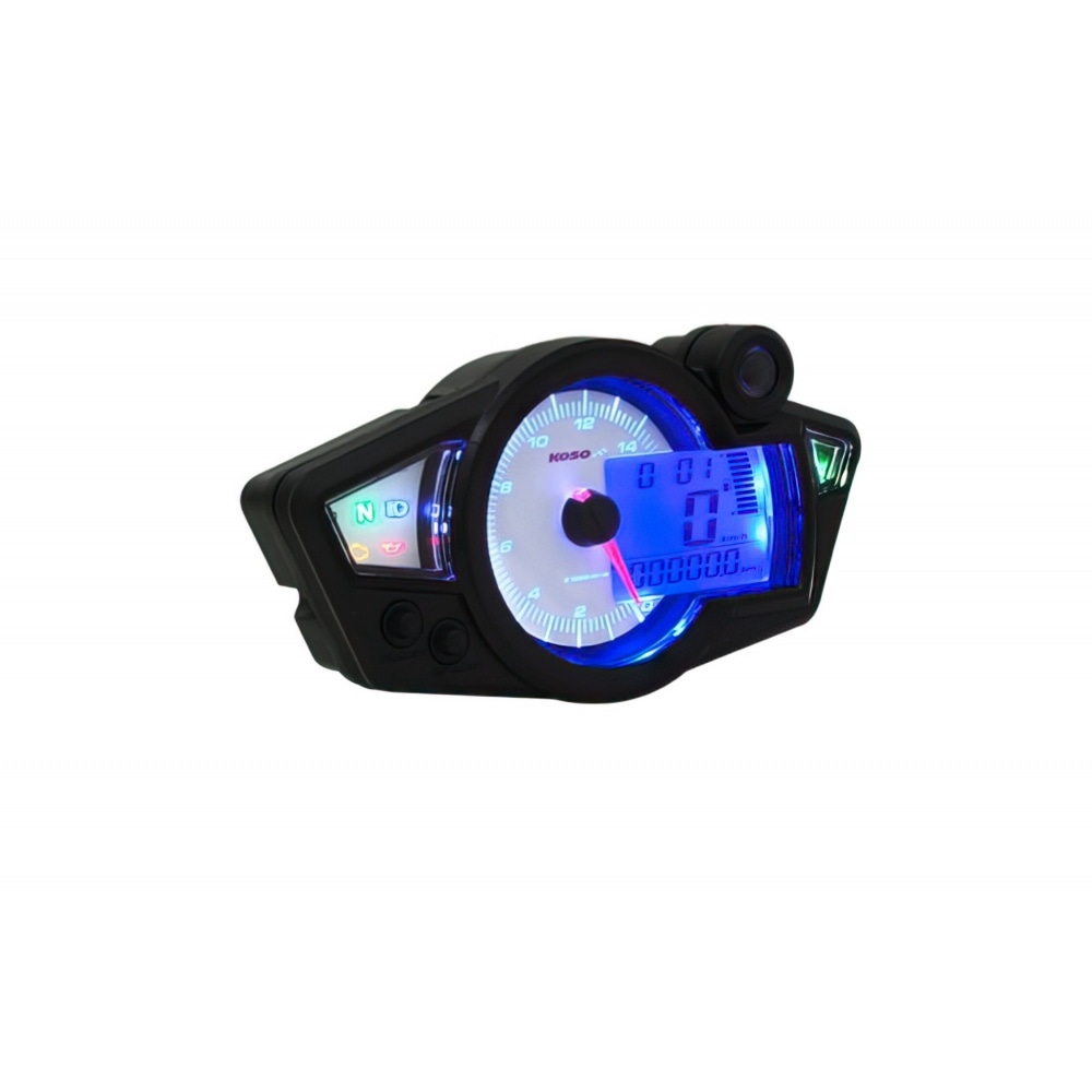 Koso Speedometer/Tachometer digital RX1N-R with white dial, blue backlighting and an illuminated pointer (for riding at night), full-featured dashboard instrument for your vehicle.
