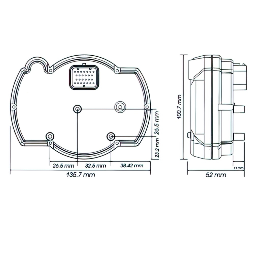 - Odometer, Time, Fuel gauge, Engine temperature, RPM, Speed Km/h, Control lights
