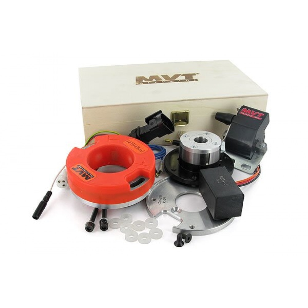The MVT Digital Direct ignitions feature variable ignition timing controlled by a CDI unit (included), meaning that ignition advance is rev-dependent in order to max out performance. The HT coil provides a discharge current of up to 42,000 V at high rpm. In addition, the Digital Direct features a 12 V supply for lighting or the electric water pump which is not common for most ignitions. This way you can keep your lighting or run a water pump.