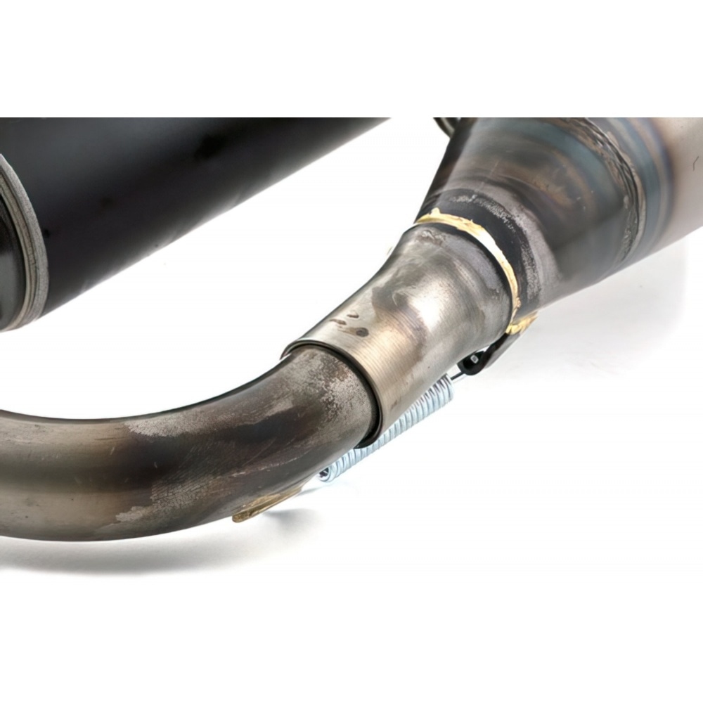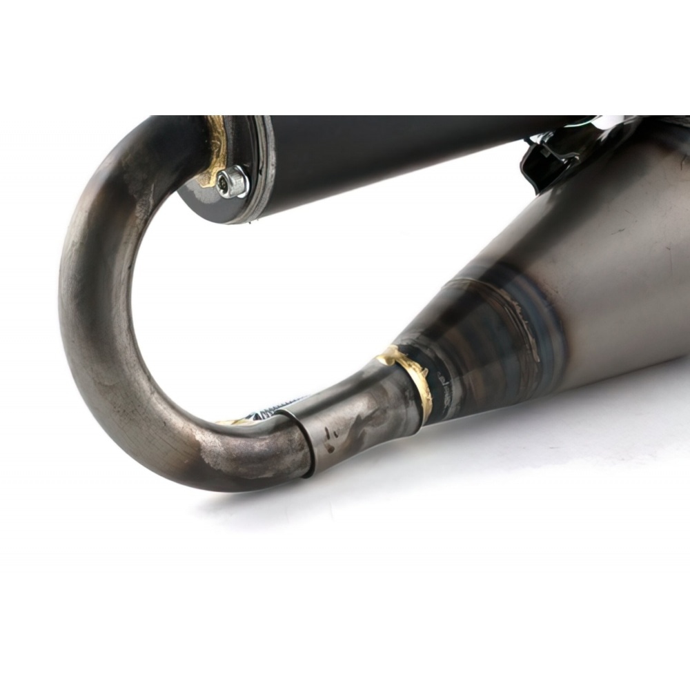 Polini now also offers the Evolution 3 exhaust for Minarelli. It has been designed with the Evolution 3 cylinder kit in mind and, if set up with suitable high-end components, a performance of more than 20 hp can be expected. Bigger changes have not been made. The Evo 3 comes with a big black aluminium rear silencer and a split flange; has been embellished with brass seams at flange and tailpipe.