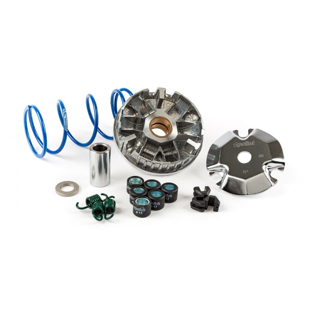 The CVT comes with a harder torque spring (+ 87%) and reinforced clutch springs (+ 35% for clutch engagement + 500 rpm). Polini strongly recommends to use a lambda emulator (P171.0010) to adjust the air/fuel ratio to increase performance so it better matches the variator.