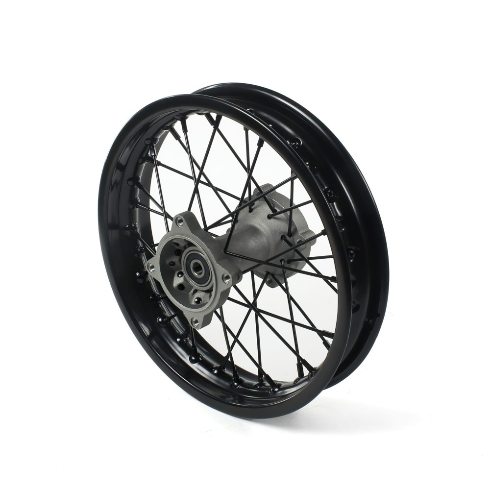Rear Wheel / Rim steel 15mm axle – 12” Pit Bike / Dirt Bike black, reinforced wheel made of sturdy steel.The wheel hub is an aluminum die-cast 76mm hub.
