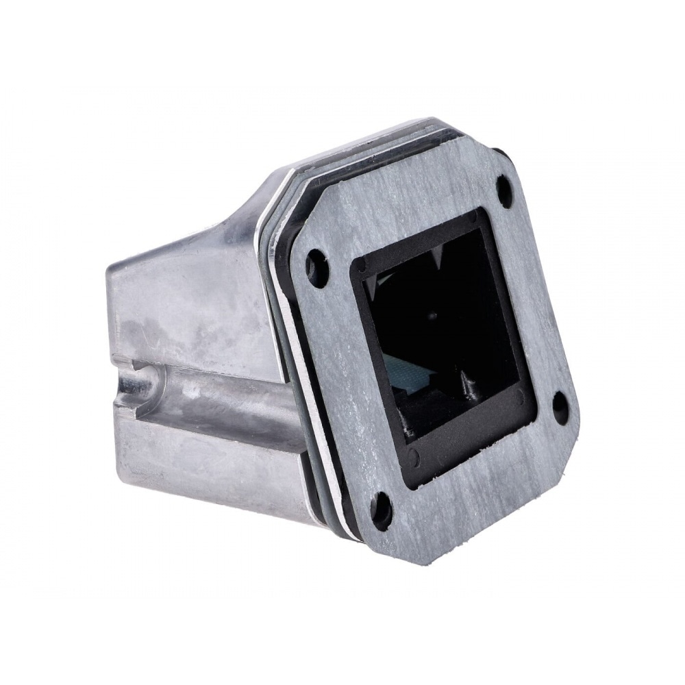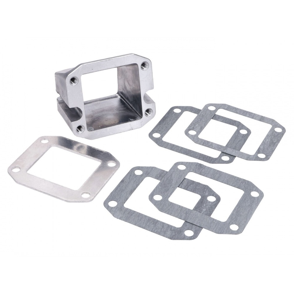 The scope of delivery includes the reed valve housing plus adapter plate and gaskets, i.e. WITHOUT the actual reed valve and reed petals. You can find matching reed valves in our store, e.g. the Malossi VL17 reed valve.