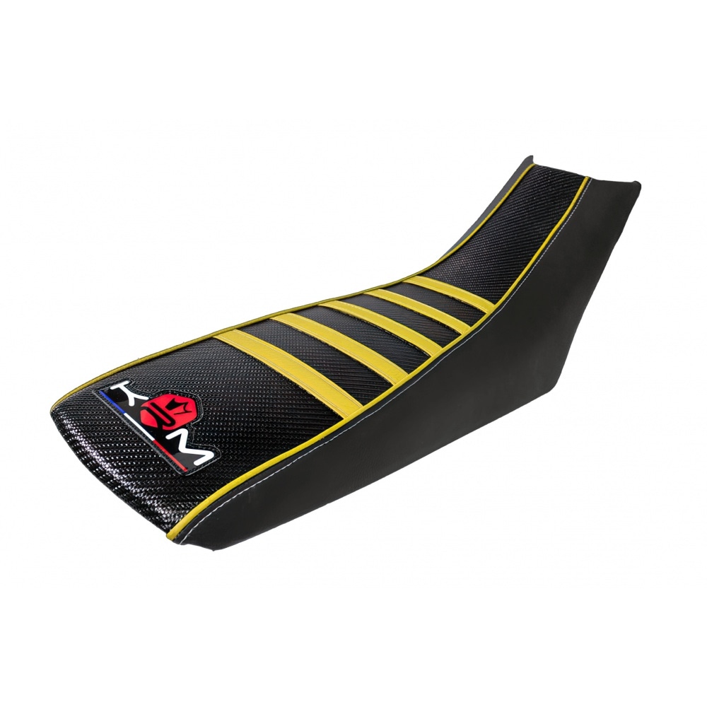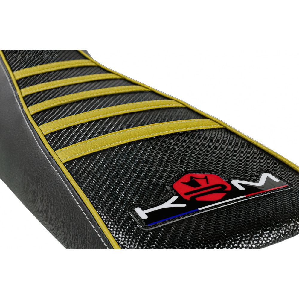 The covers are completely hand-made. The sides are black, the top is also black and has a carbon effect finish, with KRM logo and 5 coloured vertical strips. The hand-sewn strips provide reinforcement and a useful anti-slip effect to the seat which will be much appreciated by race riders and people who prefer to ride their bikes in more sporty fashion.