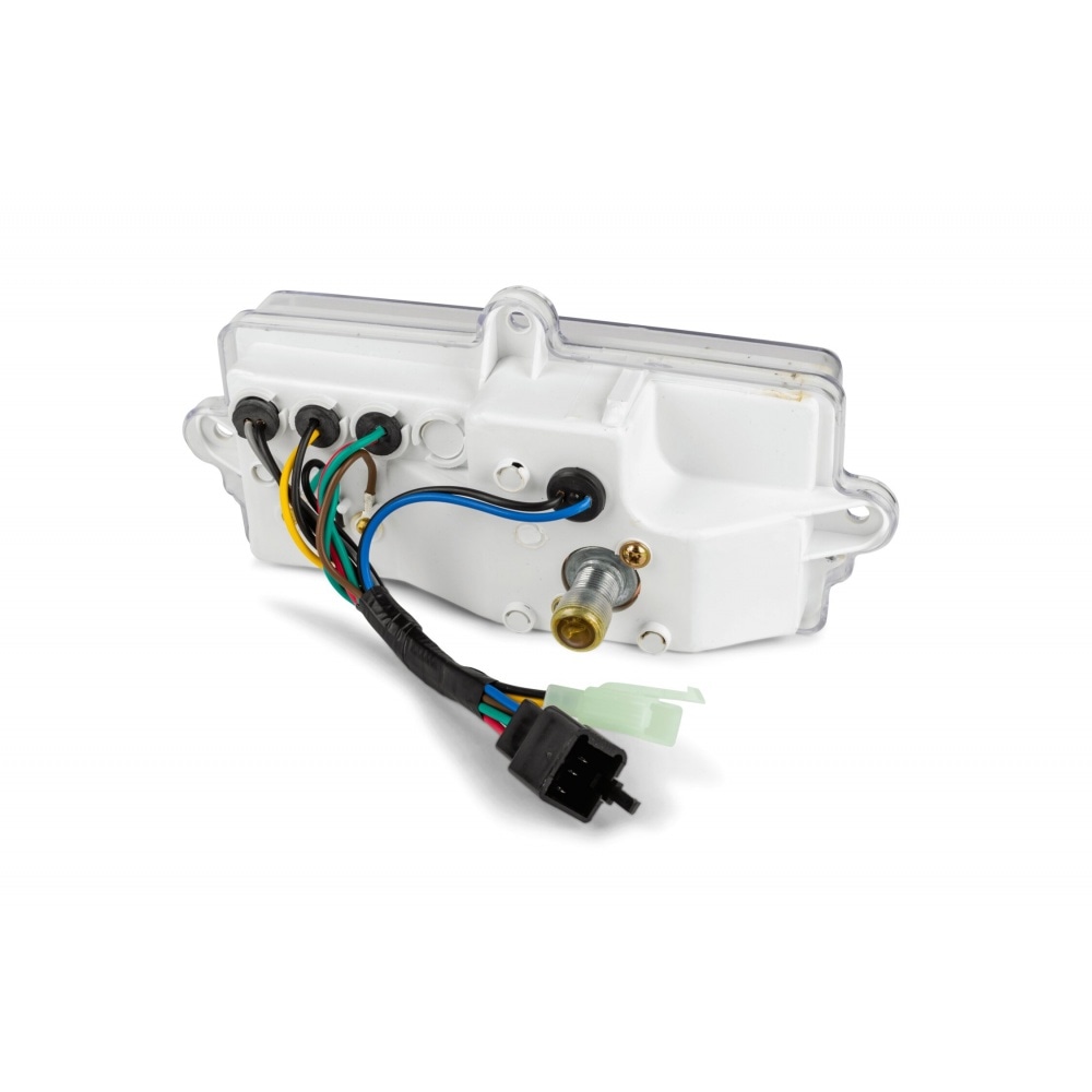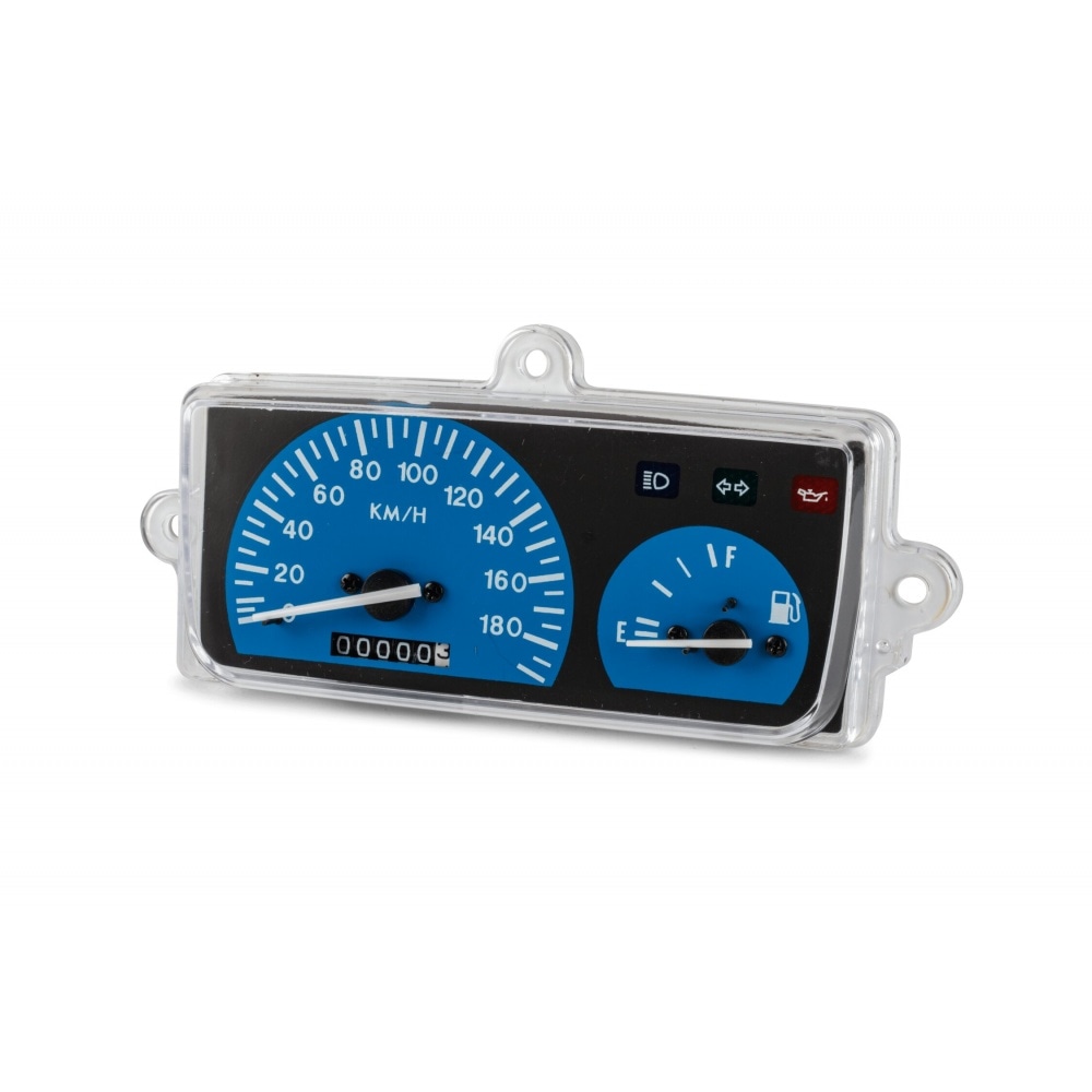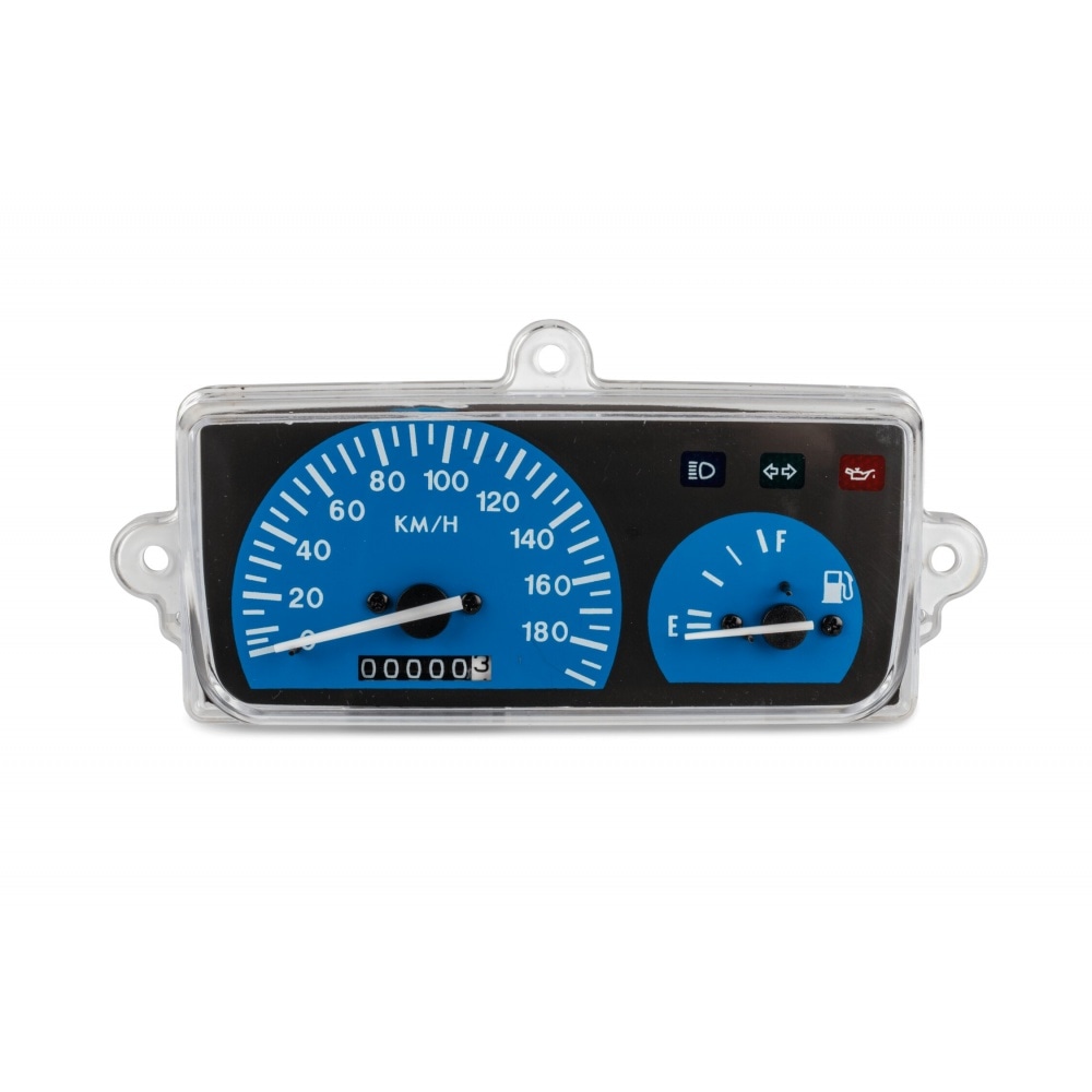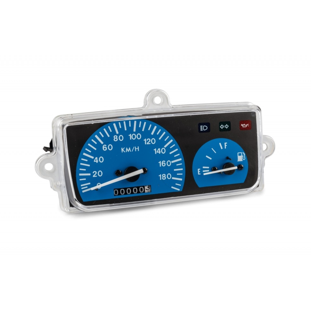 Спидометр с голубым фоном отображает скорость (км/ч), уровень топлива, пробег и имеет индикаторные лампы для поворотных сигналов, осветительных приборов и масла. Максимальная отображаемая скорость составляет 180 км/ч, что достаточно высоко, что делает этот инструмент подходящим для спортивных водителей.
