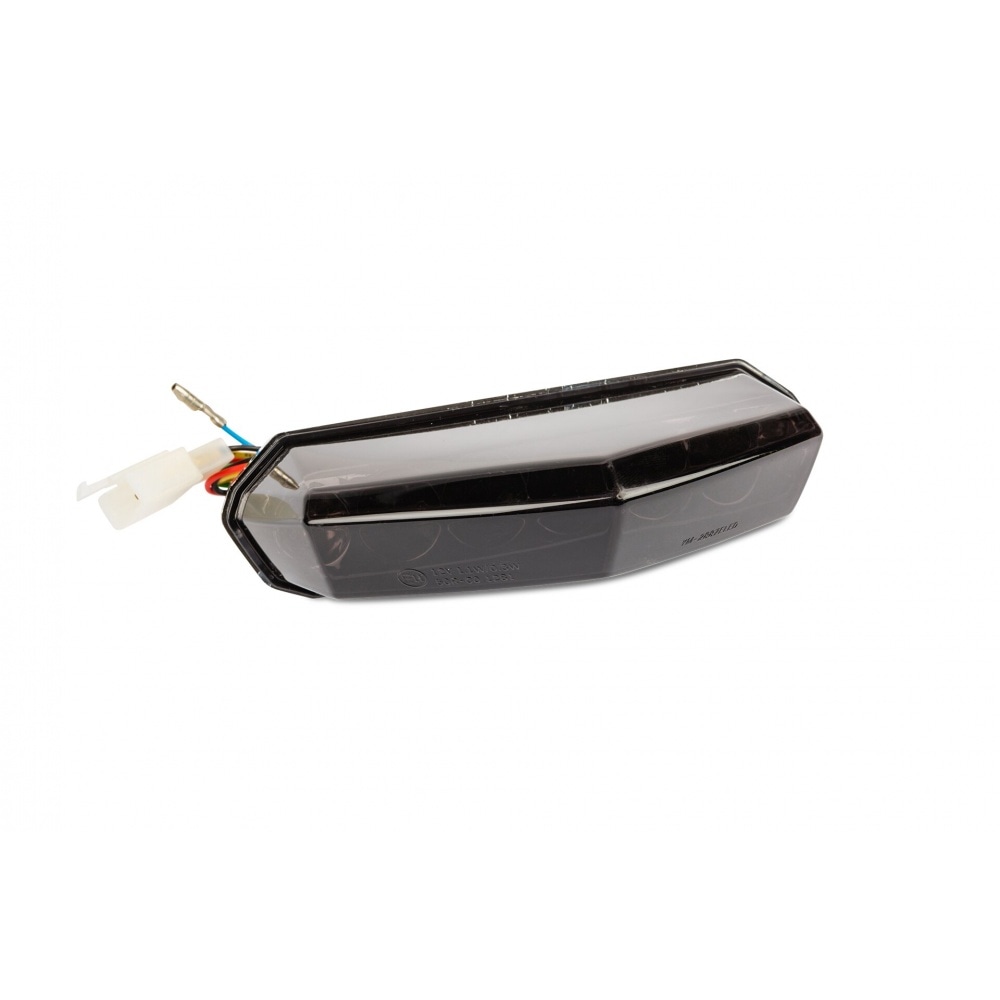 Tail Light w. indicators LED tinted CE Derbi DRD / X-Race. The taillight is equipped with LEDs, both for taillight + brake light and turn signals (integrated). The light is homologated / CE.