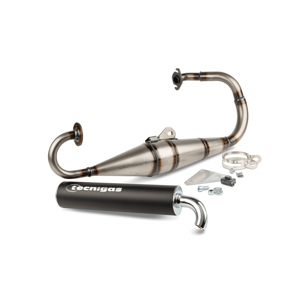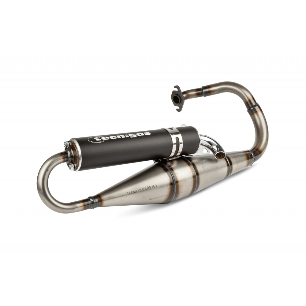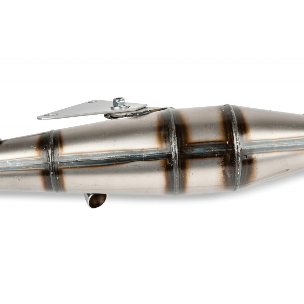 The expansion chamber now consists of 4 (instead of 3) segments. The silencer bracket has been modified and the exhaust now comes with a black aluminium silencer. In terms of performance, it is basically a sports exhaust for 50cc / 70cc sports kits.