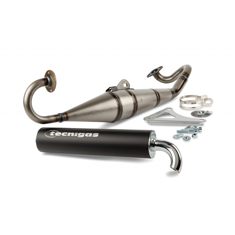 The successor of the Tecnigas Next exhaust – Tecnigas Exhaust Next R Peugeot Ludix AC / LC (Peugeot horizontal AC and LC).The expansion chamber is made of rolled and welded metal sheets and comes with a black aluminium silencer.