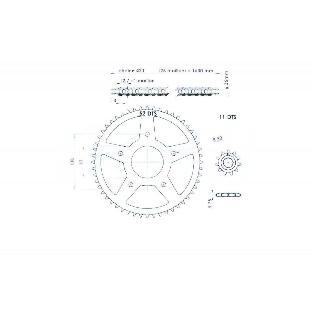 Chain Kit 11×52 – 420 d=62mm 5 holes Peugeot XP7 / XR7 at a really fair price.Standard chain kits to replace old and worn chain transmission parts; chains can get rusty or stretch too much, the sprocket teeth are getting sharper over time.After installing the chain, make sure to adjust the tension properly!