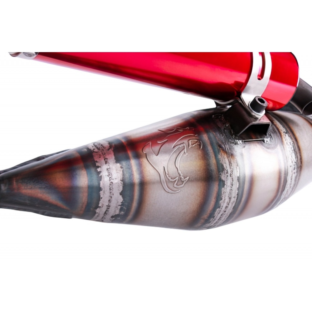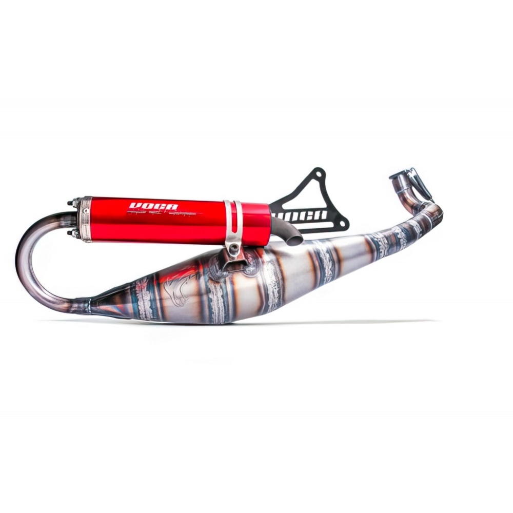 Voca Exhaust Road Race 70cc Red Minarelli horizontal (Yamaha Aerox etc.), top quality race exhaust for 70cc 2-stroke models with Minarelli horizontal engine. The body is hand-welded from 10 (!) 0.8mm thin steel cones, It comes with a stunning-looking red silencer – 100% Racing. Small parts for mounting are included, the exhaust is fixed with 3 screws. The bracket with laser-cut Voca logo is painted black.