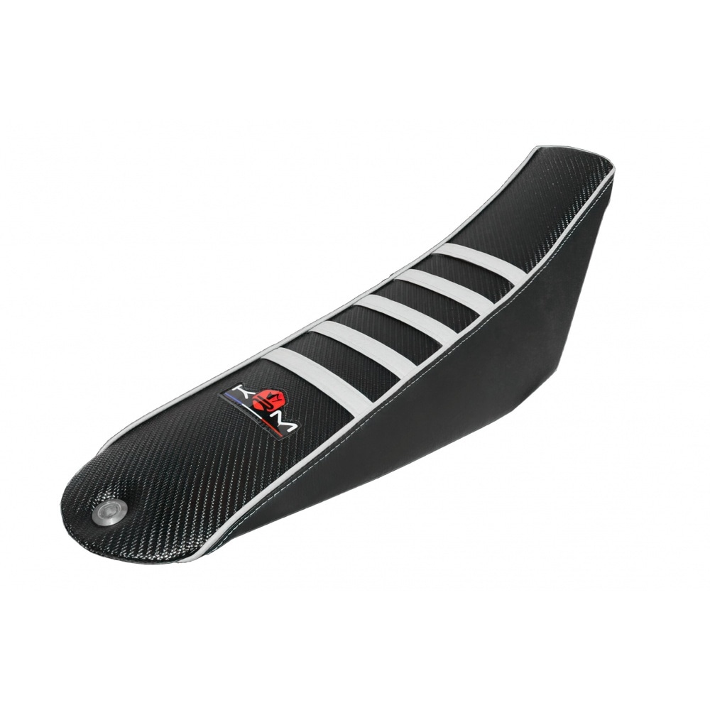 The covers are completely hand-made. The sides are black, the top is also black and has a carbon effect finish, with KRM logo and 5 coloured vertical strips. The hand-sewn strips provide reinforcement and a useful anti-slip effect to the seat which will be much appreciated by race riders and people who prefer to ride their bikes in more sporty fashion.