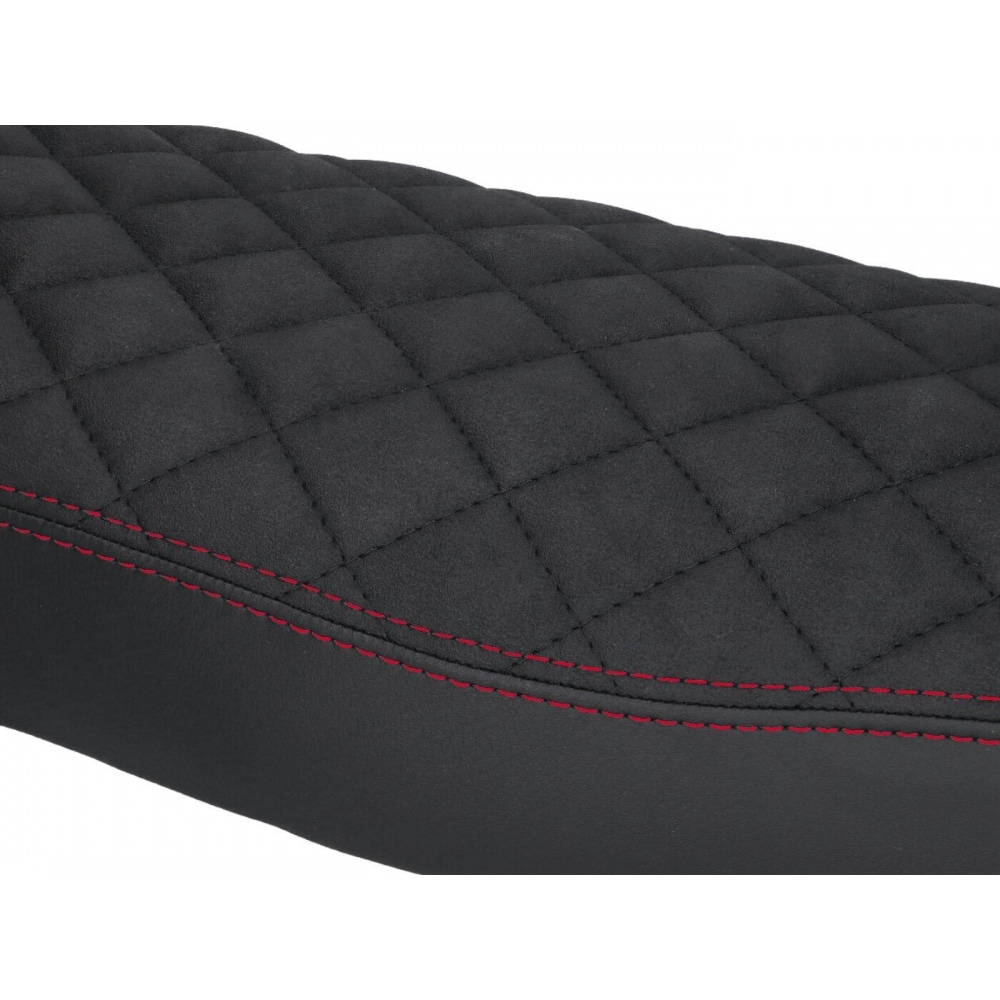 The Schmitt seat cover is tailored to fit the original Simson seat, stretched with an integrated cord and secured to the seat plate with staples.