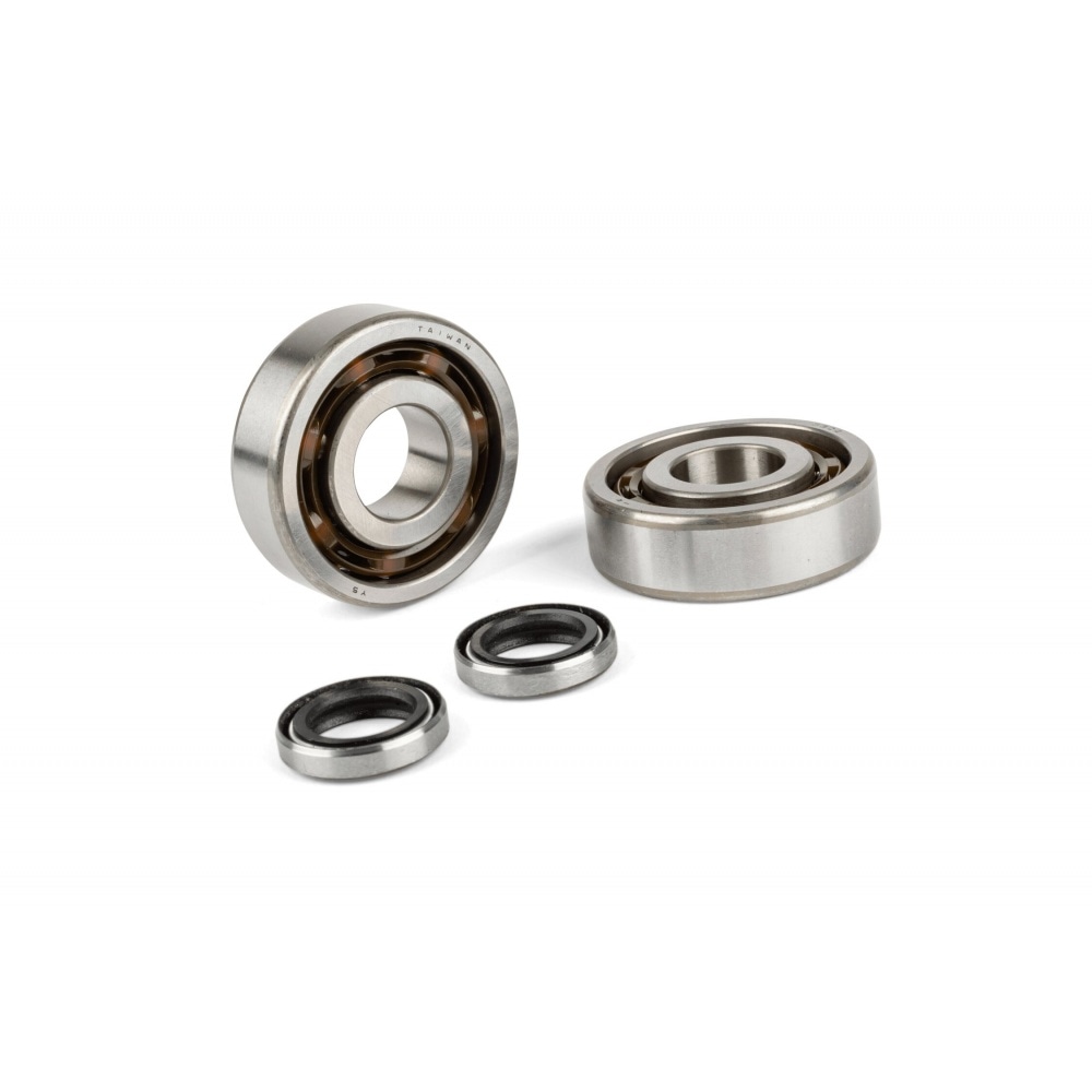 Set crankshaft bearings + oil seals reinforced C3 cage polyamide MBK 51 / 88. This set includes 2x 6302QR bearings and 2 oil seals.