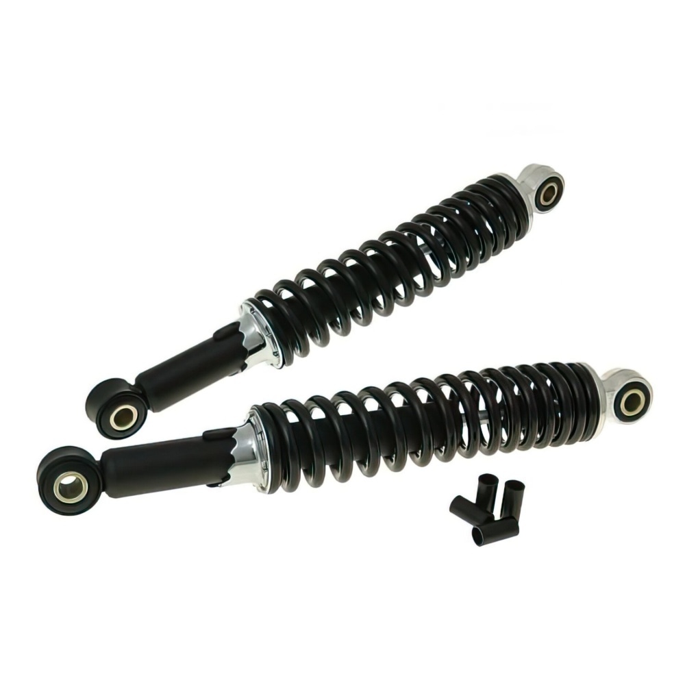 Shock Absorber 300mm black (x2), universal replacement for classic mopeds. The top mount is 21mm wide and has a diameter of 32mm, the bottom mount is also 21mm wide and has a diameter of 30mm. The bushings that come with the shock allow for installation with either 8 or 10mm screws.