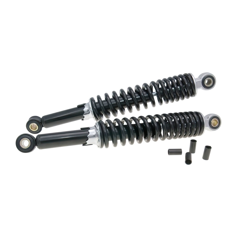 Shock Absorber 320mm black (x2), universal replacement for classic mopeds. The top mount is 21mm wide and has a diameter of 32mm, the bottom mount is also 21mm wide and has a diameter of 30mm. The bushings that come with the shock allow for installation with either 8 or 10mm screws.