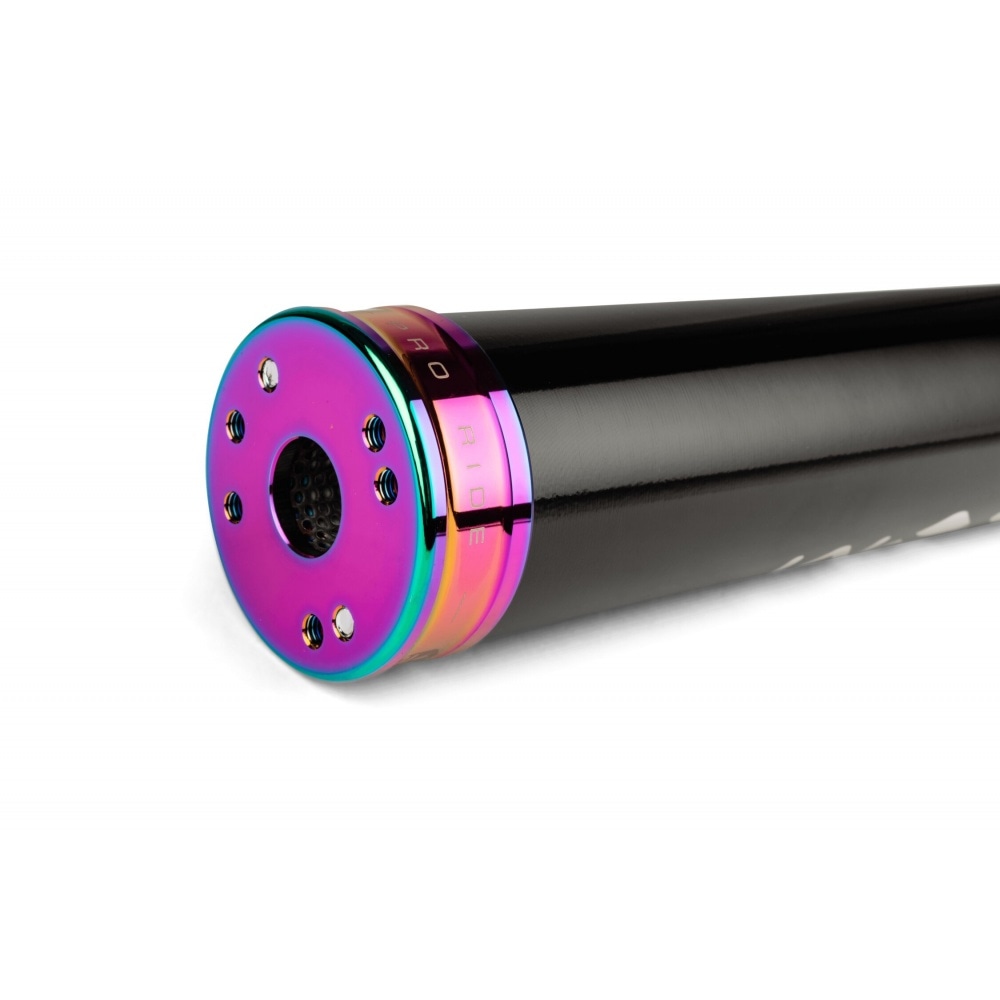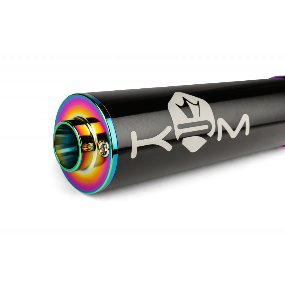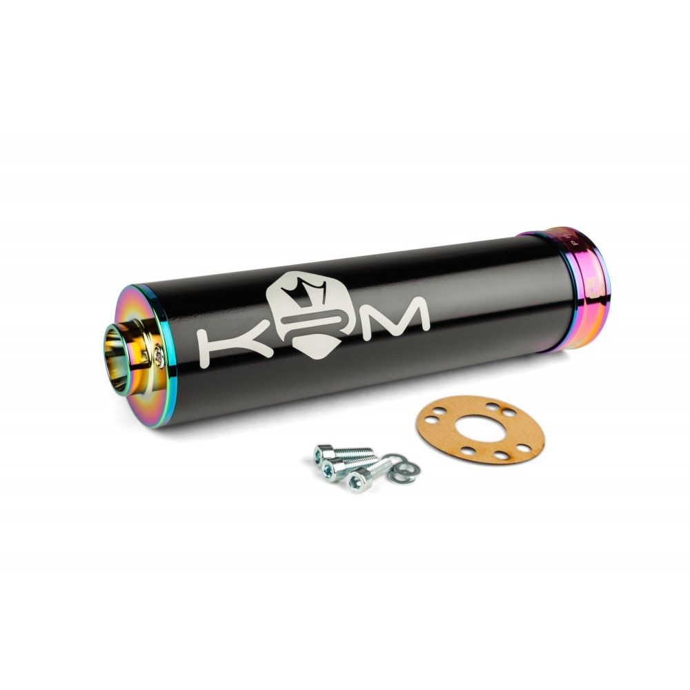 Silencer KRM Pro Ride, high quality aluminum silencer, perfect for KRM's powerful racing exhausts and compatible with many other tuning exhausts. This is the KRM Pro Ride Silencer in Black / Neochrome. It was developed for 70cc to 90cc engines and will get you a slight but noticeable increase in power.
