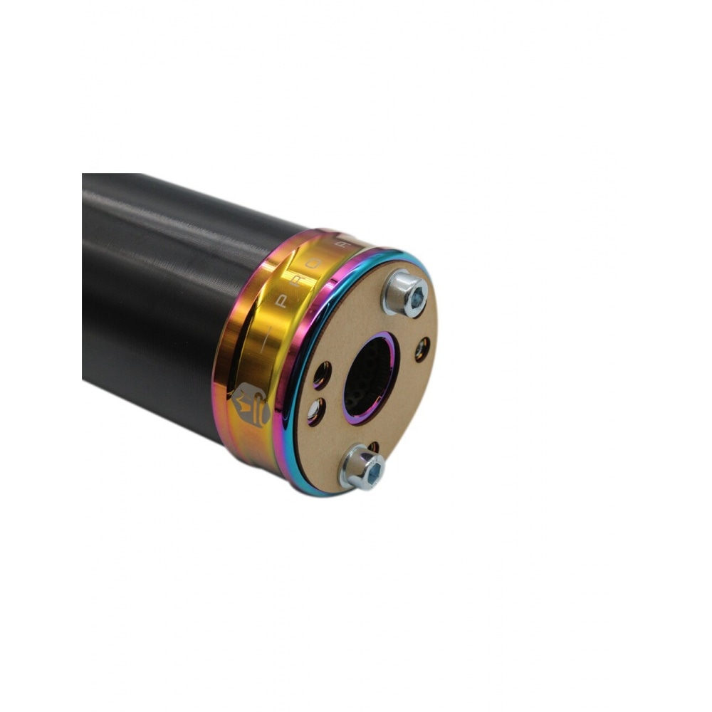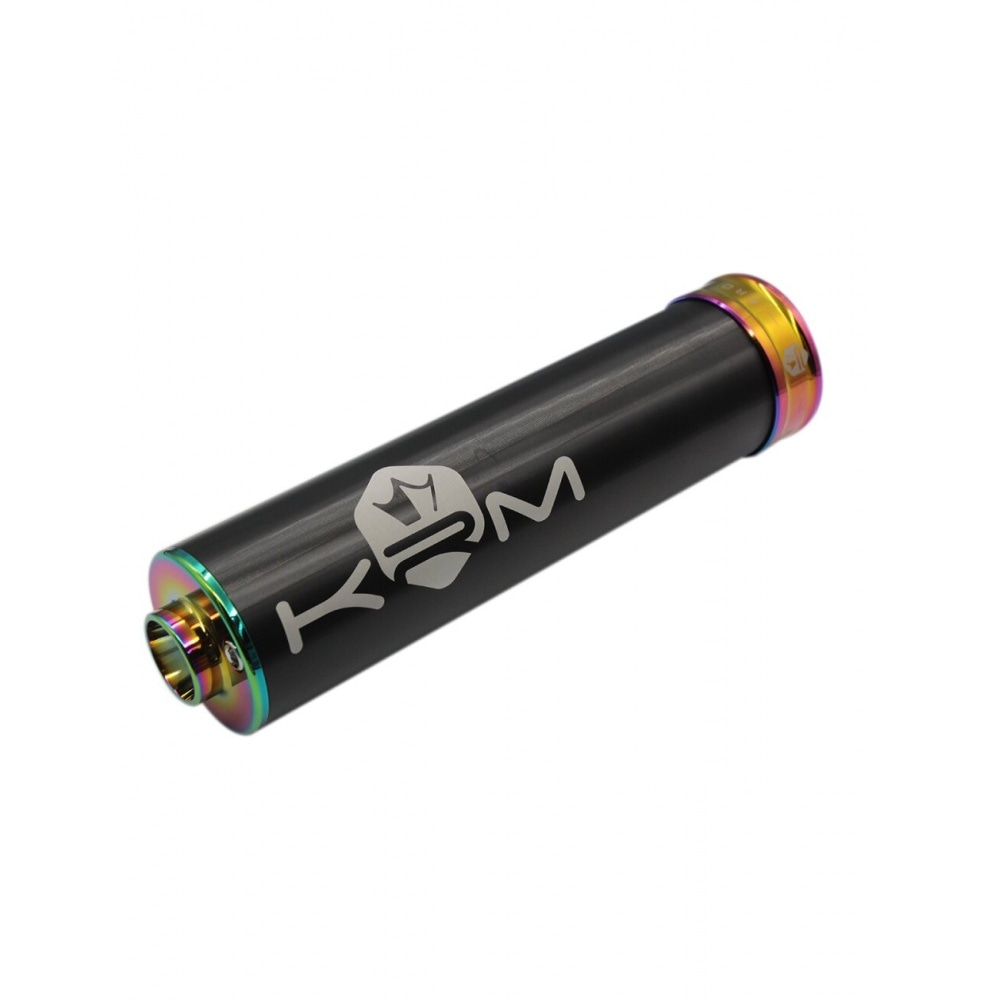 Silencer KRM Pro Ride, high quality aluminum silencer, perfect for KRM's powerful racing exhausts and compatible with many other tuning exhausts. This is the KRM Pro Ride Silencer in Black / Neochrome. It was developed for 90cc to 110cc engines and will get you a slight but noticeable increase in power.