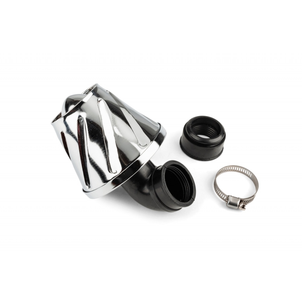 STR8 Air Filter Helix 38 / 28mm – turbine style wire mesh air filter, with angled connection. It comes with an adapter to allow for use with 12 – 21mm carburetors. Note: using this kind of tuning filter means you should increase the size of your main jet by 10 to 20.
