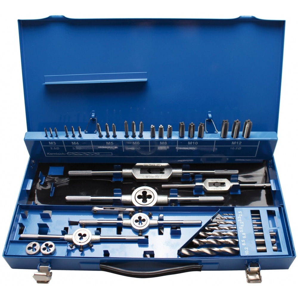 High quality Tap and Die Set from BGS. Including all standard taps and dies from M3 to M12 as well as thread gauges. The kit comes in a robust metal case.