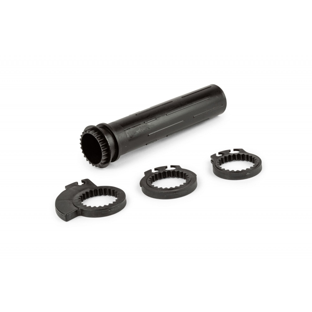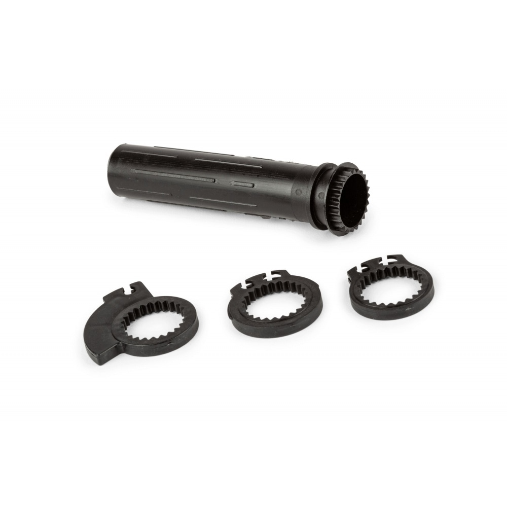 Throttle grip with 3 positions at a great price. This special throttle grip with 3 interchangeable reels for the cable allows for adjusting throttle twist / rotation, from aggressive quick action short twist to long sensitive twist. There are 3 positions: short, medium and long.