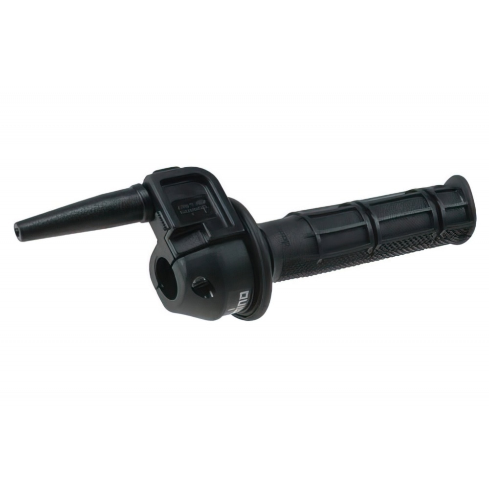 Tomasselli’s quick action throttle in various designs. You can choose between black and aluminium/ chrome and whether the throttle cable will lead away horizontally or upwards. Below this product description, you can see the stroke and the twisting angle. The shorter the twisting angle, the faster the slide valve opens. We recommend smaller angles for quarter-mile and drag races and bigger angles for road use.