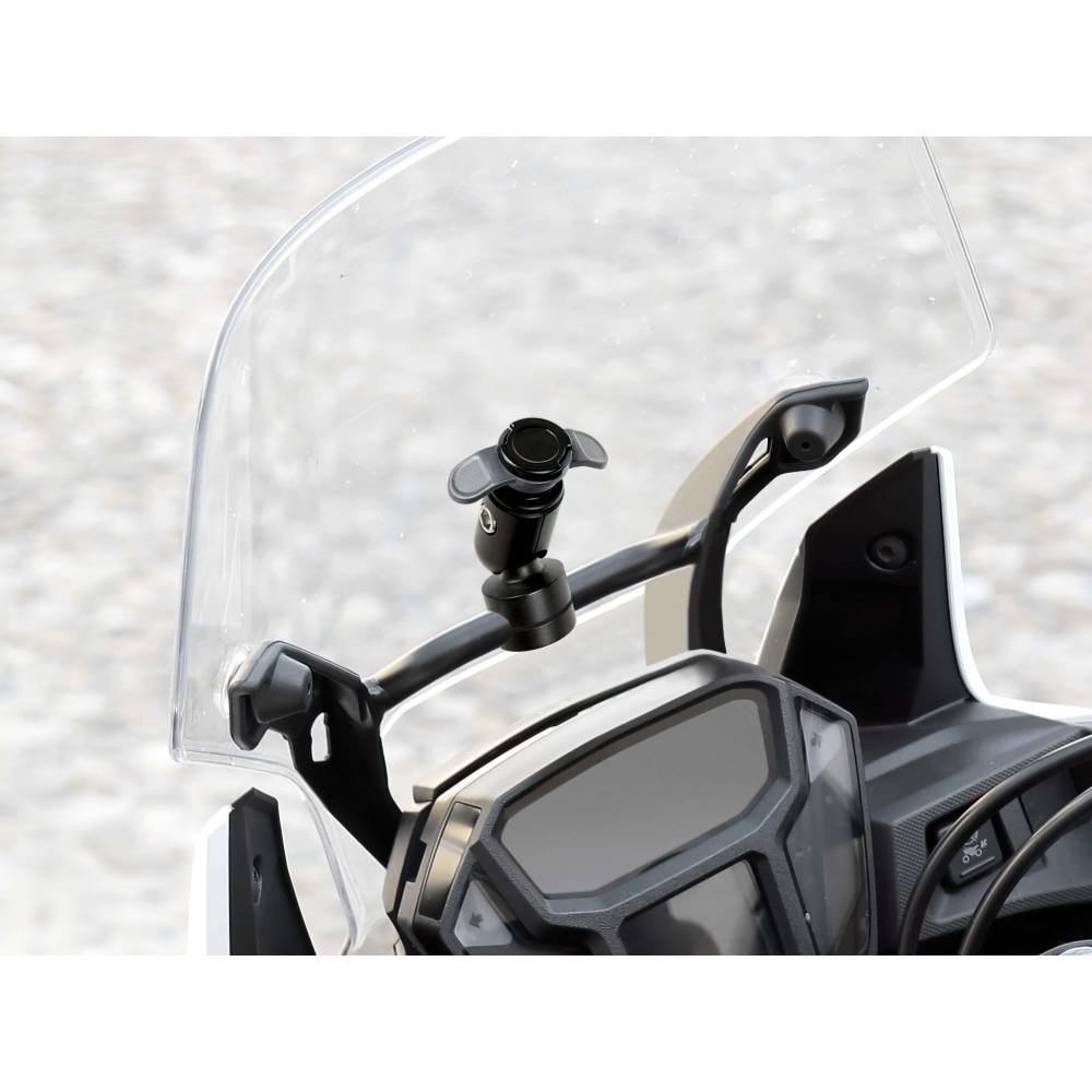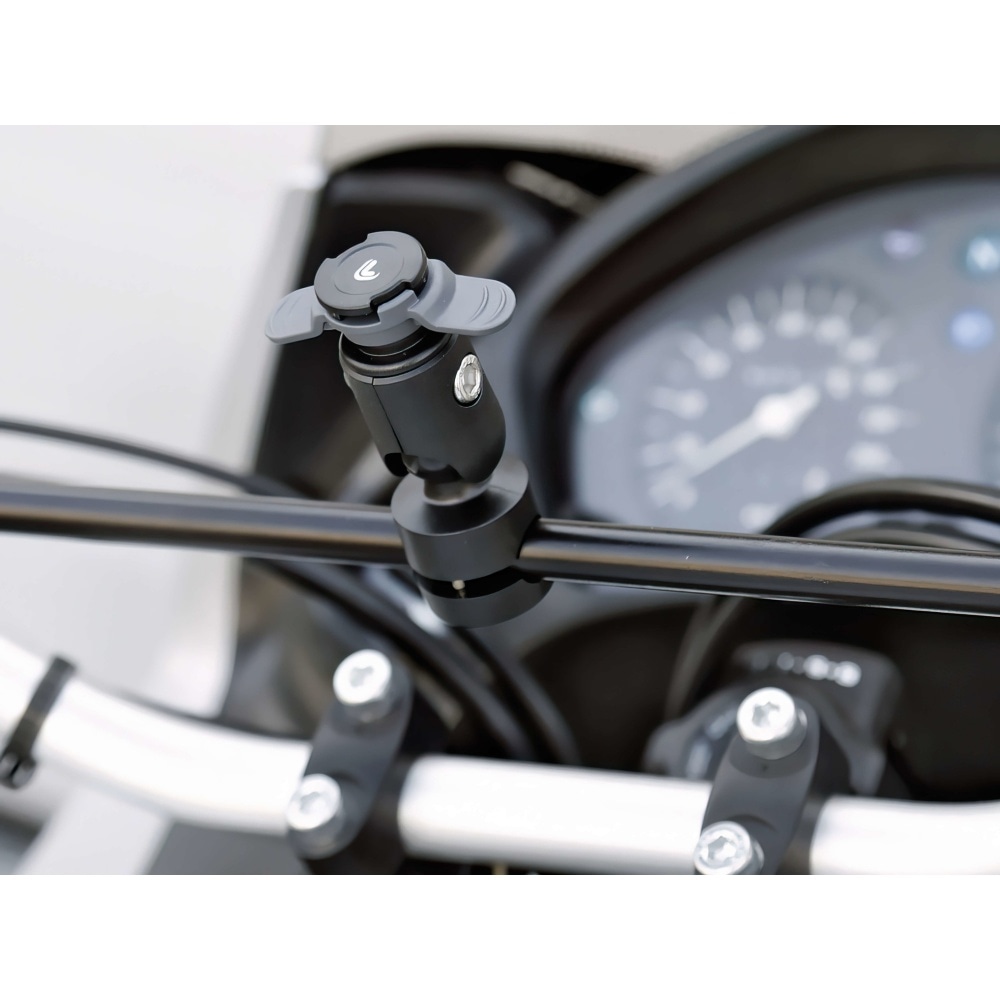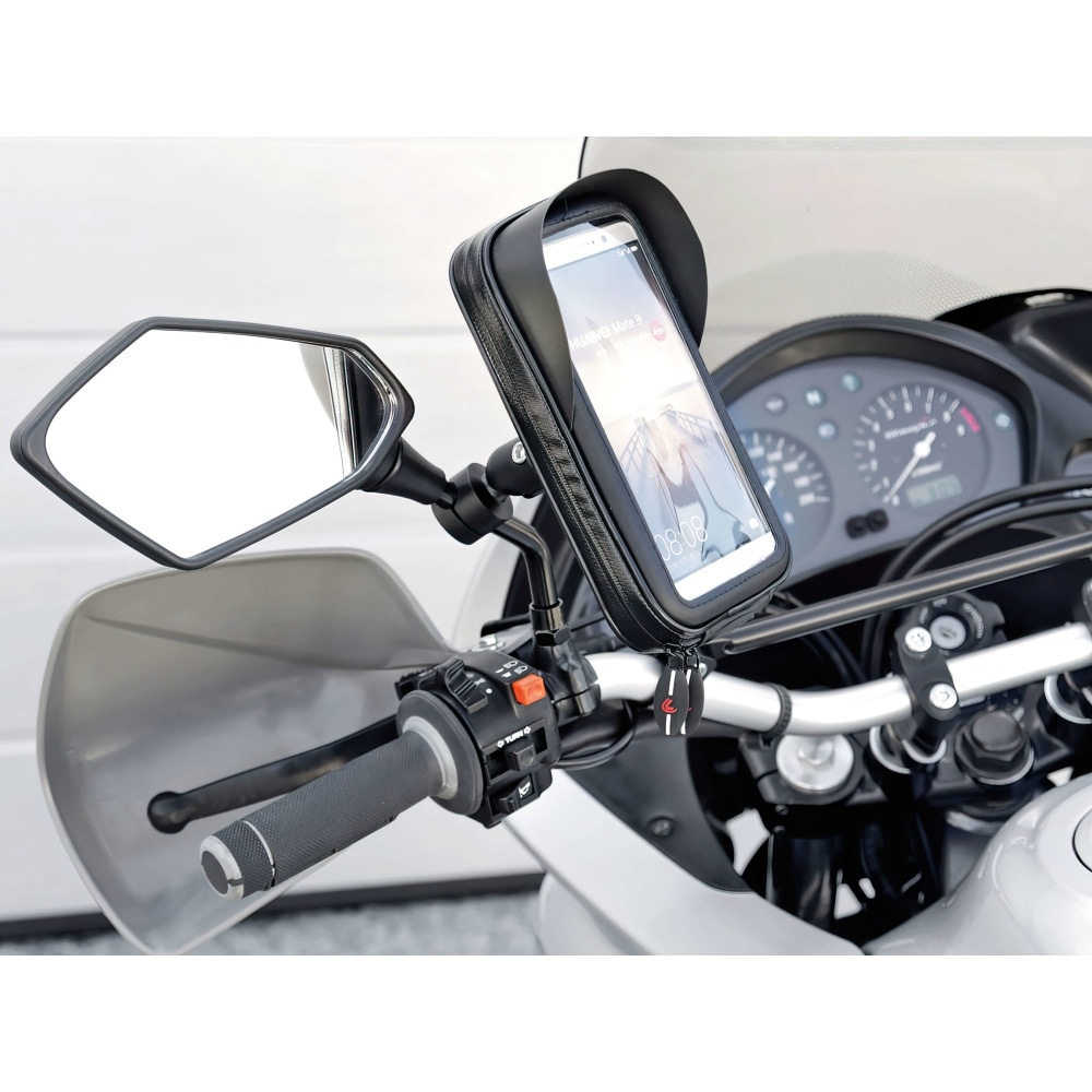 Fits mirrors with 9 mm to 14 mm clamp and allows both vertical and horizontal use and display of the phone.
