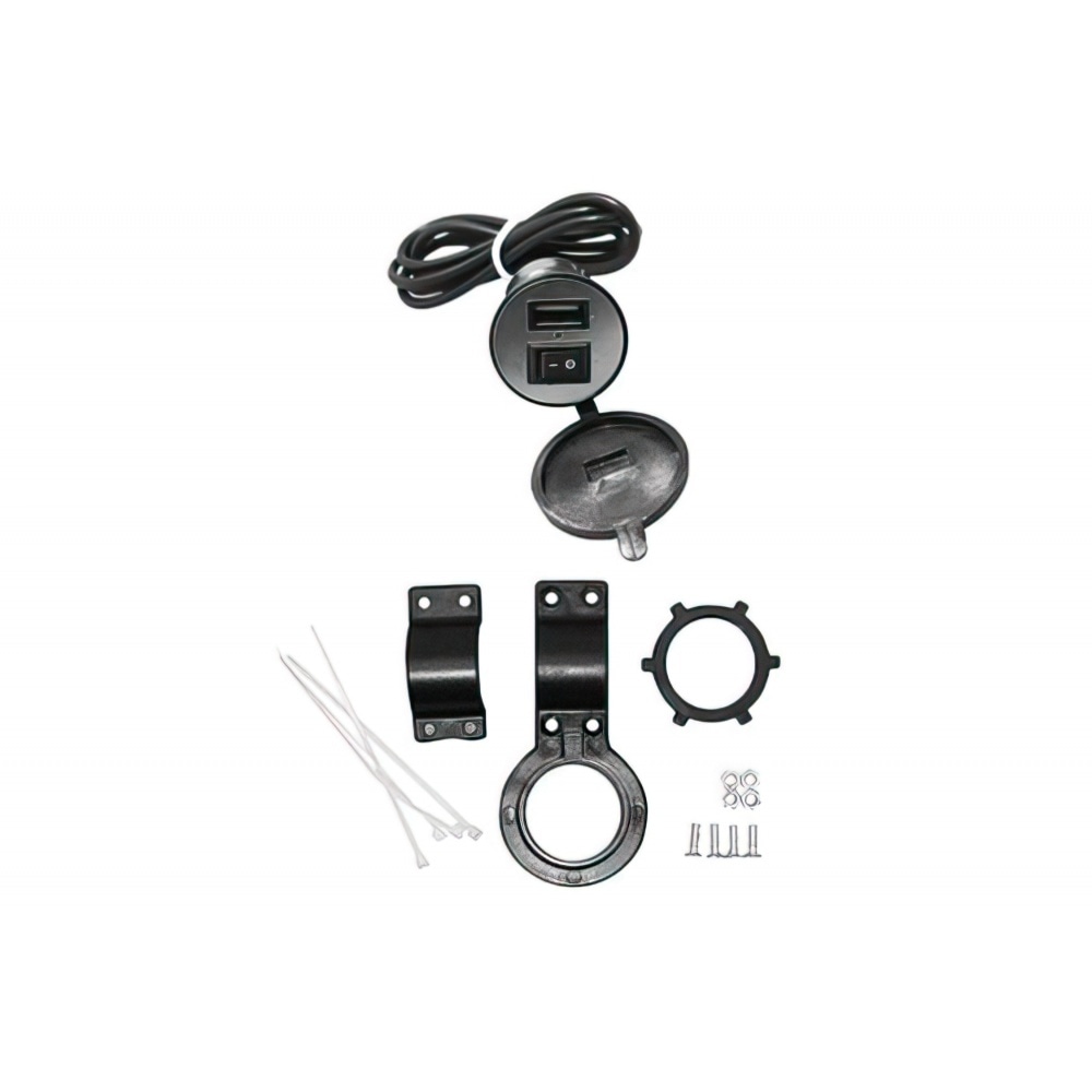 USB Charger 12V – 2A, handlebar. The charger with on / off switch allows for charging electronic devices (smartphone, satnav). The handlebar mount has a 22mm diameter, meaning it can be installed on all standard 22mm handlebars. Supply voltage is 12V (scooter battery).