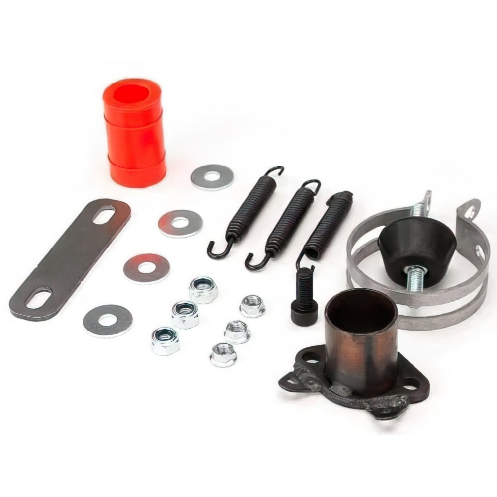 The body is hand-welded out of of thin sheet metal pieces and is uncoated; it comes with a great looking carbon silencer. The high-end racing exhaust was developed for 80cc and higher displacement engines. Shape and volume were designed to be best suited for tuned / racing set-ups. It favours high rpm, where it is most powerful, and it will considerably increase top speed.