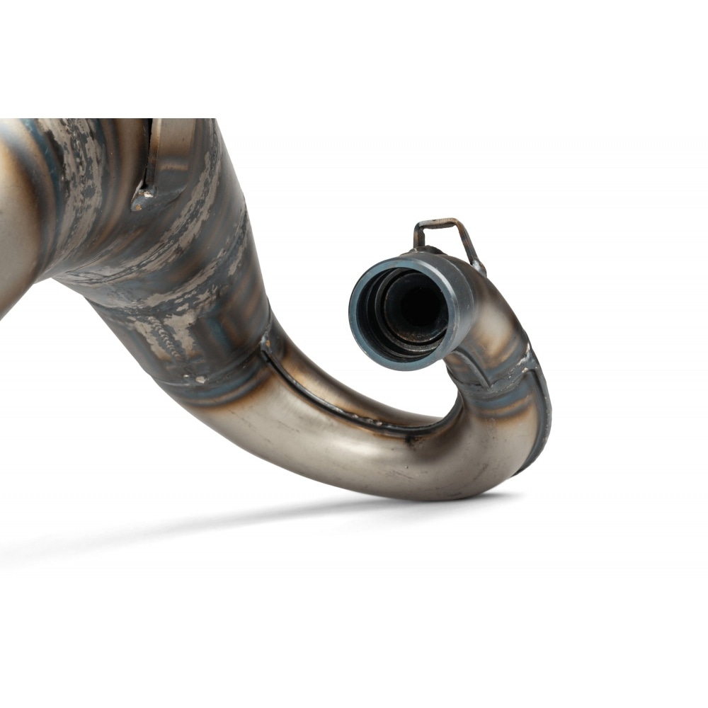 The body is hand-welded out of of thin sheet metal pieces and is uncoated; it comes with a great looking black aluminium silencer. The high-end racing exhaust was developed for 50cc and 70cc engines. Shape and volume were designed to be best suited for sport, mid-race and racing configurations. It favours high rpm, where it is most powerful, and it will considerably increase top speed.