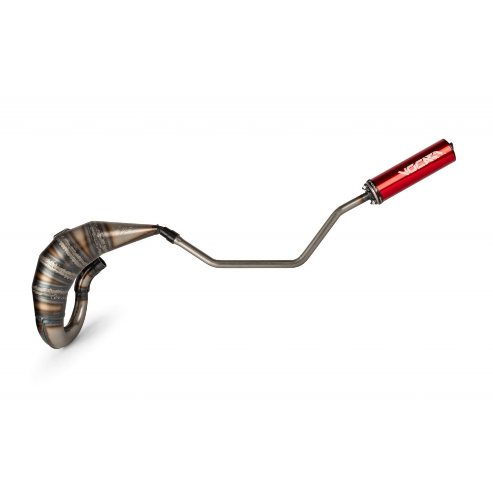 It is hand-welded out of of thin sheet metal and is uncoated; it comes with a great looking red aluminium silencer. The high-end racing exhaust was developed for 50cc and 70cc engines. Shape and volume were designed to be best suited for sports and racing configurations. It favours high rpm, where it is most powerful, and it will considerably increase top speed.