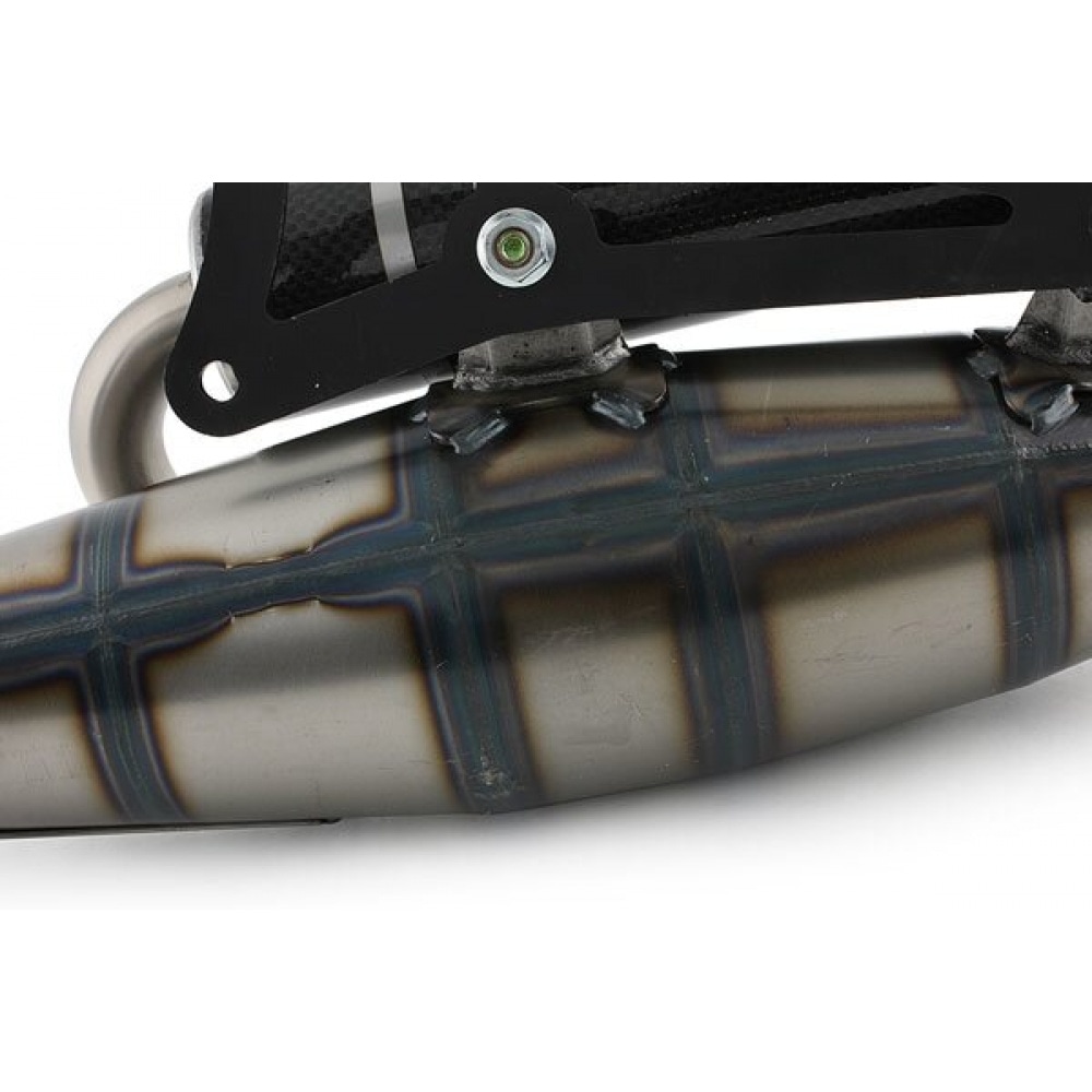 Sheet metal expansion chamber complemented by a carbon silencer (also available in different versions).