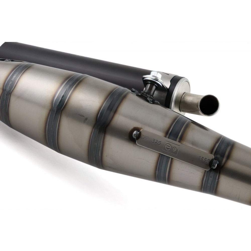Sheet metal expansion chamber complemented by a black aluminium silencer. The “City 16” is a street-legal exhaust inspired by Yasuni’s racing exhaust “Carrera 16”.