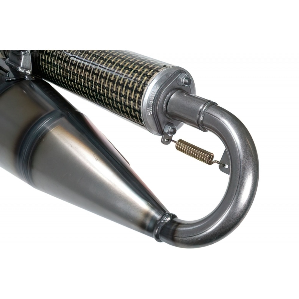 Sheet metal expansion chamber complemented by a carbon/Aramid aluminium silencer. The “City 16” is a street-legal exhaust inspired by Yasuni’s racing exhaust “Carrera 16”.